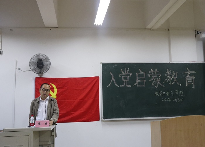 为了加强2020级新生对党的认识,树立入党志向,端正入党动机,提高政治思想素质。10月30日下午,教育与音乐学院分别在线下课堂和线上云课堂开展2020级新生入党启蒙教育,教育与音乐学院党总支书记周杰为本次新生入学教育主讲人。