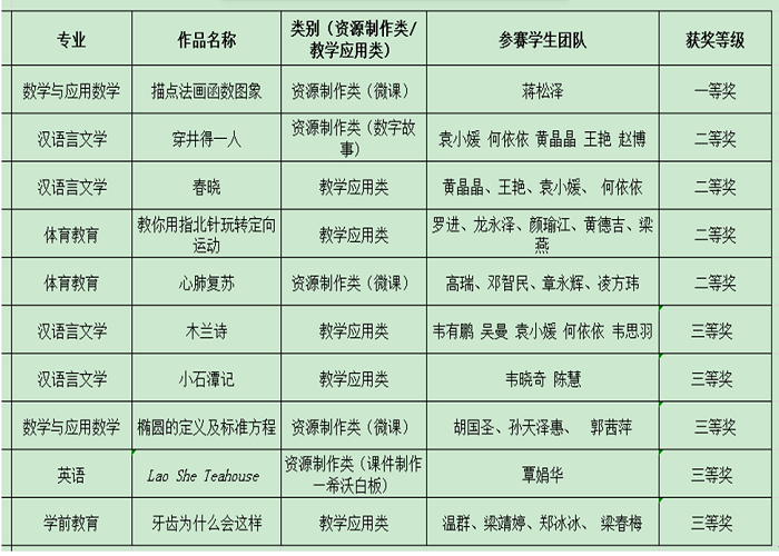 11月2日,由自治区教育厅主办、广西教育技术学学会和南宁师范大学联合承办的全区师范生信息化教学应用比赛在官网公布比赛结果。我校选送的16件作品分别参加资源制作类(微课)、教学应用类的评比,获得一等奖1项,二等奖4项,三等奖5项的优异成绩,继2019年比赛之后再获一等奖佳绩。