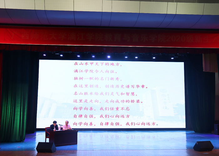 为激发2020级新生的爱校荣校轻快,增强学生对学校的认同感、归属感和荣誉感。11月7日晚,教育与音乐学院在弘善讲堂开展主题为《爱校荣校,共创和谐校园》主题讲座,此次活动由我校校歌《造就人才的殿堂》作词者曾宪瑞、教育与音乐学院院长彭超主讲。教育与音乐学院团总支书记余华,教育与音乐学院团总支副书记、2020级舞蹈学辅导员张超博以及学院2020级全体新生参与了此次活动。