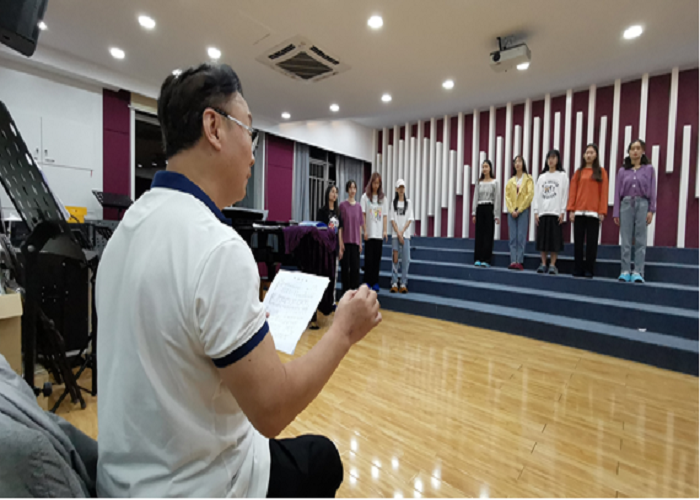 除此之外,关老师针对器乐合奏节目中的乐器配置、演奏声部的均衡性、速度和力度等方面提出了建议;针对女生小组唱的发声、力度等方面进行了精心的指导。