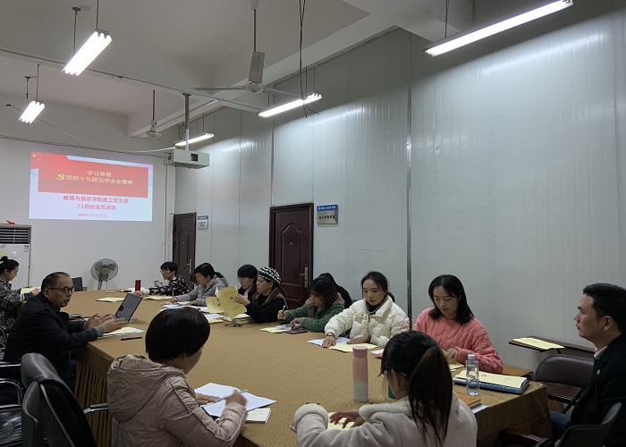 教育与音乐学院教工党支部于2020年11月25日组织全体教师党员开展11月份理论学习活动,本次集中学习的主题是学习贯彻党的十九届五中全会精神,教育与音乐学院党总支书记周杰作为本次政治理论学习主讲人。