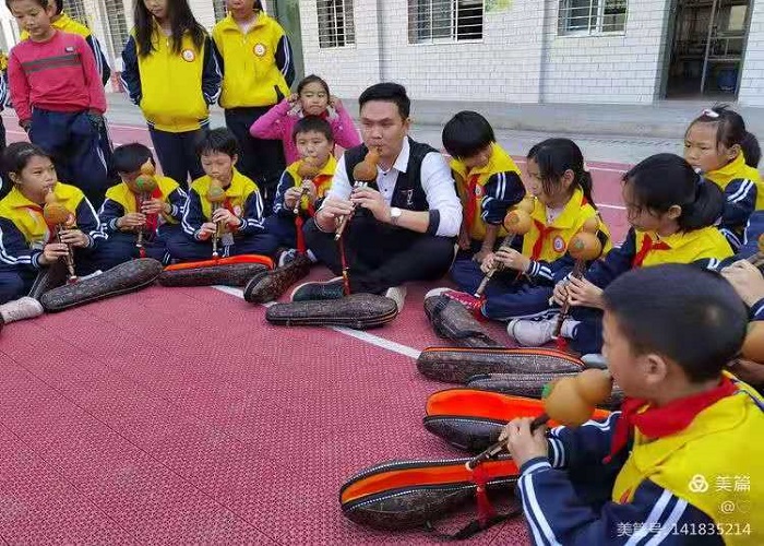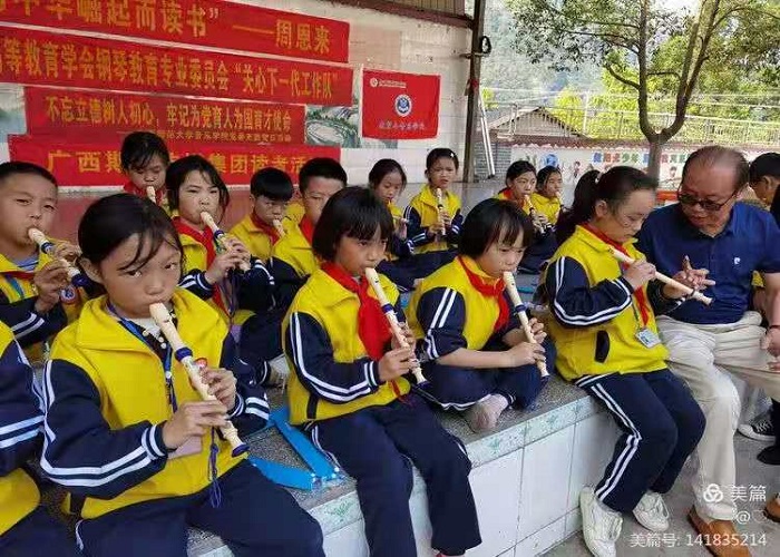 中午休息片刻后,下午1点半,广西师范大学音乐学院老师、同学们为孩子们带来了生动的义教课,包括竖笛教学、口风琴教学、葫芦丝教学、舞蹈教学。广西师范大学音乐学院教授、硕士研究生导师彭超通过呼吸教学、音阶教学、指法教学,手把手让孩子们从“零”到吹出一些简单的旋律;广西师范大学音乐学院音乐学系主任林冬副教授带领孩子们在舞蹈中快乐地吹响口风琴……