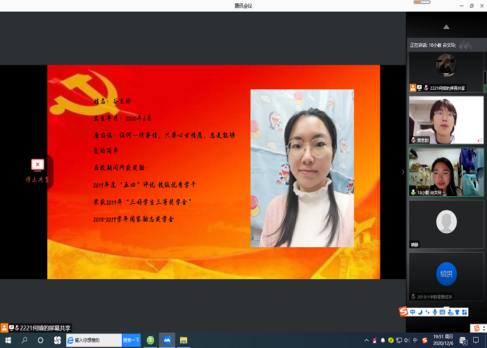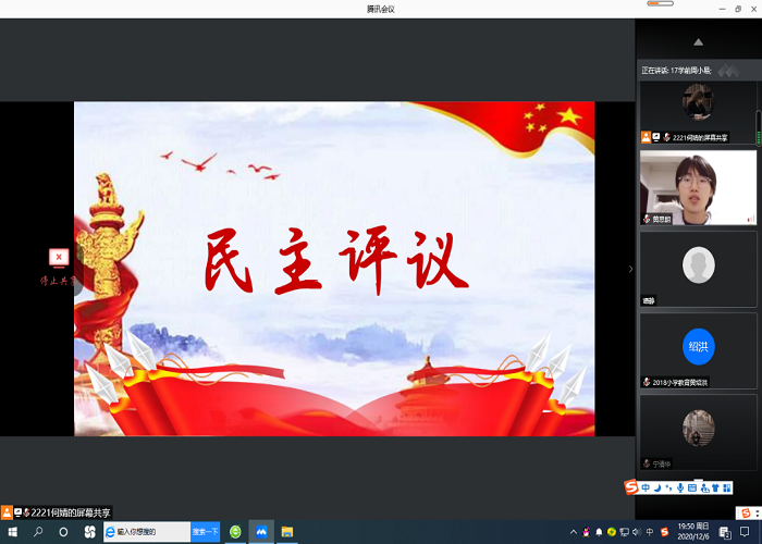 12月6日晚上,教育与音乐学院学前教育学生党支部通过线上云端腾讯会议举行“教育与音乐学院学前教育学生党支部支部大会”。本次出席活动的嘉宾有党总支书记周杰书记、学前教育学前教育学前党支部书记王越书记、党总支组织委员黄思朗老师、以及学前教育学生党支部所有成员。
