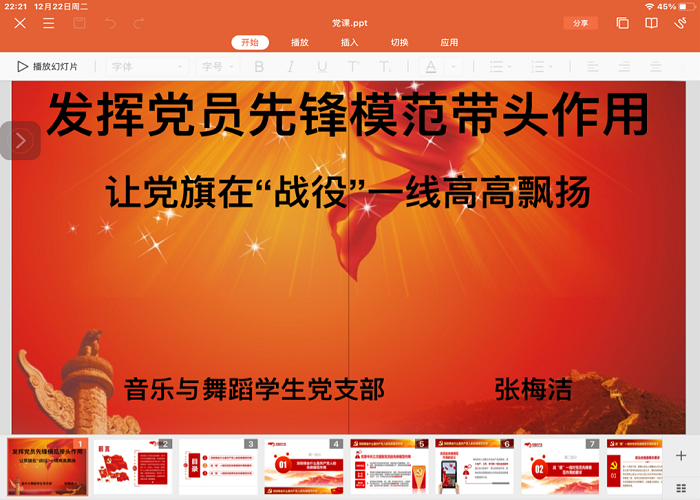 为加强基层党组织建设和党员思想建设,12月22日中午教育与音乐学院音乐与舞蹈学生党支部在小音乐厅开展了“发挥党员先锋模范带头作用,让党旗在‘战役’一线高高飘扬”专题党课。党支部书记张梅洁同志担任党课主讲人。党支部全体党员、预备党员和积极分子参加党课学习。