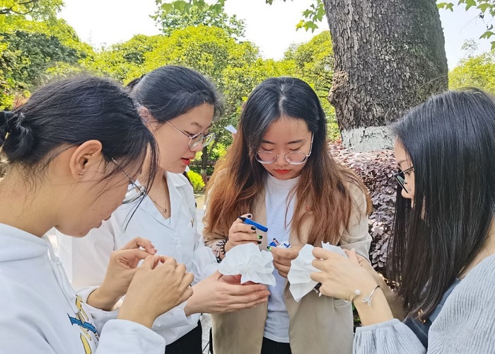 本次党日活动围绕“缅怀革命先烈,促进作风建设”为主题展开,共分为两大部分。首先主持人介绍了本次党日活动目的及意义,随后讲解了陈光烈士的英勇事迹,以及陈光烈士纪念碑的相关构造及其构造意义。为了更好地表达对革命先烈的缅怀,现场组织支部党员用纸巾手工做花,敬献英雄。听了陈光烈士的英雄事迹,感受过手工做花献英雄,预备党员陈雅雯、林美欣就本次活动分享了自己的感受:缅怀先烈,我们要继承革命先烈的遗志,发扬党的优良传统与作风,铭记身上的使命,为中华民族伟大复兴而奋斗。随后王越老师也分享了自己的活动感受,她表示:广大党员应该在今后的学习生活中继续传承先辈们的红色基因,始终牢记践行初心使命。