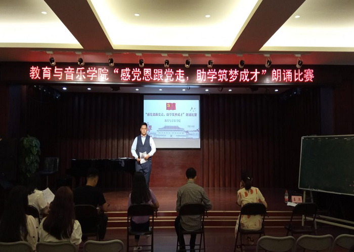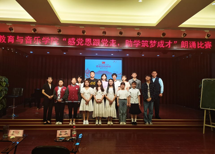 为庆祝建党100周年,培育受助学生的爱党爱国情感和感恩意识,进一步加强我院学生资助政策宣传工作,进一步促进教育公平、营造和谐的教育氛围,激励家庭经济困难学生克服困难、自强自立、努力成才。教育与音乐学院于5月14日下午三点在小音乐厅顺利举行“感党恩跟党走,助学筑梦成才”主题朗诵比赛,本次比赛邀请学院书记周杰老师、副书记熊云云老师及各年级专业辅导员作为本次比赛评委。