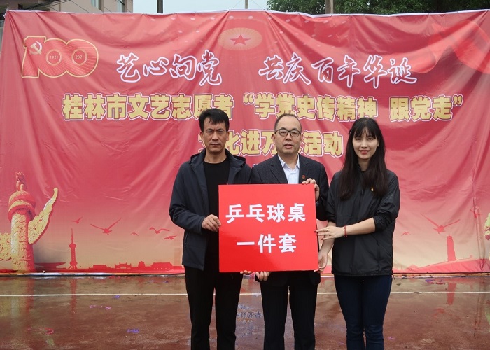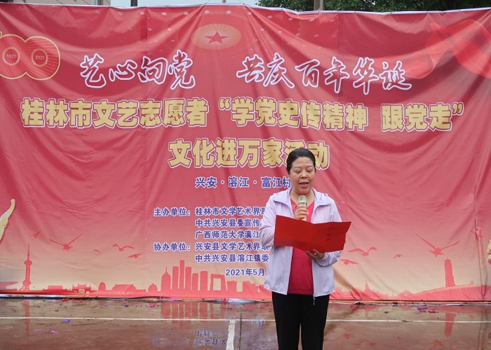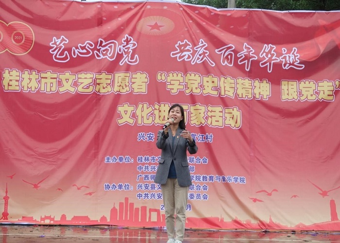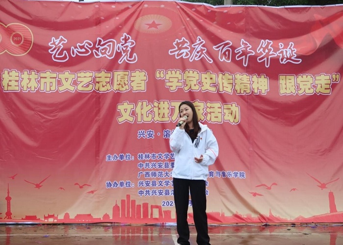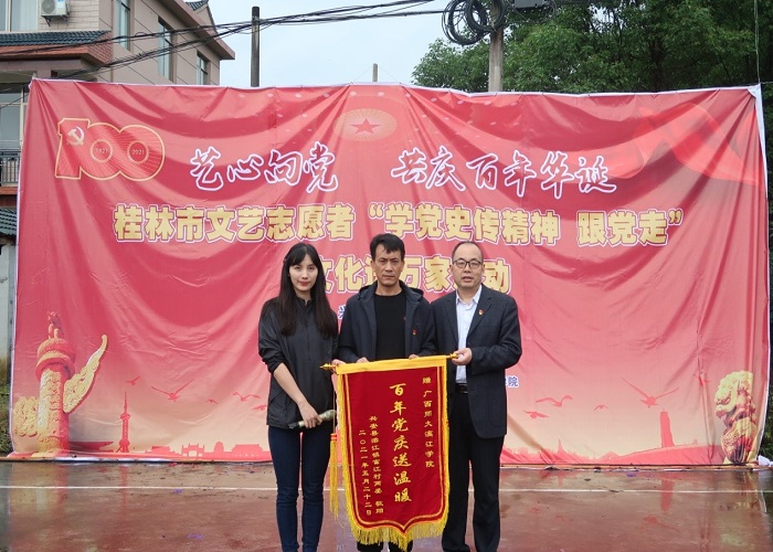 今年是建党100周年,为贯彻落实习近平总书记在党史学习教育动员大会上的讲话精神,践行“学党史 办实事”的要求,助推乡村文化振兴,广西师范大学漓江学院教育与音乐学院与桂林市文学艺术界联合会联合举办文化公益下乡活动。