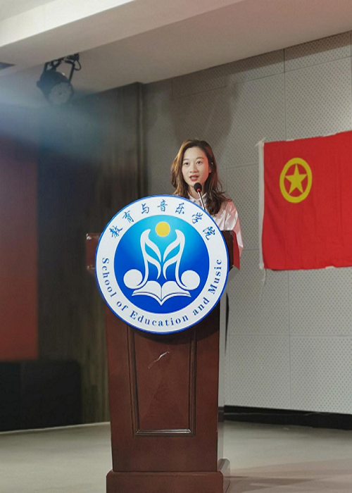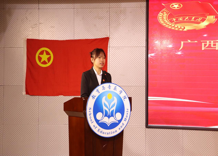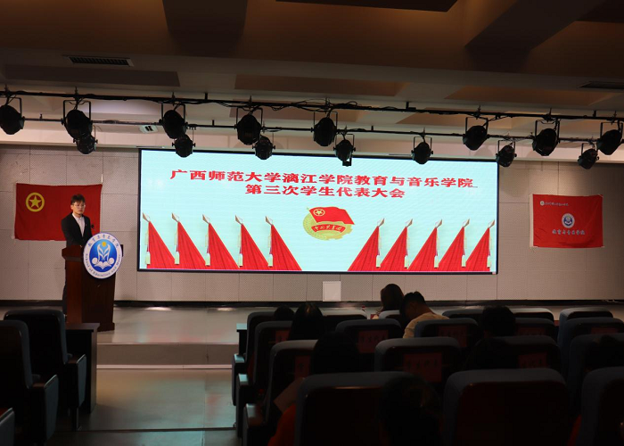 (图:学生代表汤钰作《广西师范大学漓江学院教育与音乐学院第三届团总支学生会工作报告》)