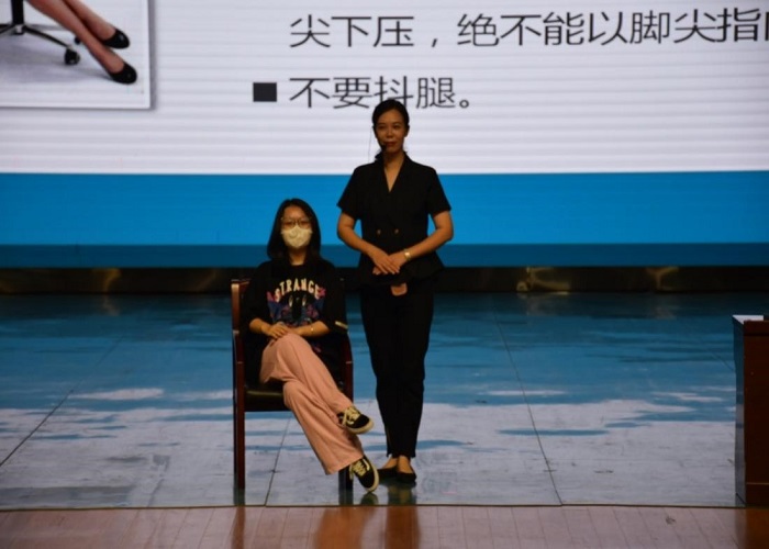礼仪文化的核心是“自尊,自爱”,作为新一代大学生,大家要更加注重由内到外的气质表现和外表的修饰。从“站、立、行、走、坐”到与人交往真诚、得体。冯凯琦老师向同学们示范了日常生活中应当掌握的礼仪体态,并邀请同学上台学习正确的礼仪动作,整堂课都充满了乐趣。