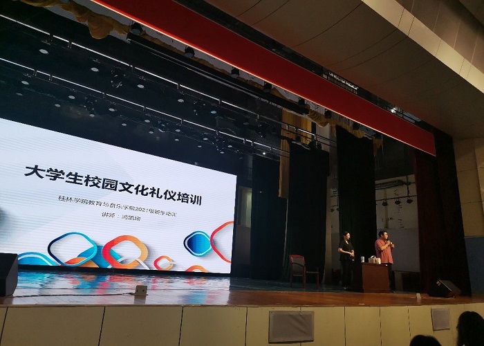 为了加强我校学生的礼仪文化知识,提升学生的社交文虎素养,营造良好的学习生活氛围,教育与音乐学院于2021年9月21日上午9:00在弘善讲堂开展展大学生校园文化礼仪教育培训专题讲座。教育与音乐学院有幸邀请到优秀女企业家,国际注册礼仪培训师冯凯琦女士担任本次活动的主讲嘉宾。