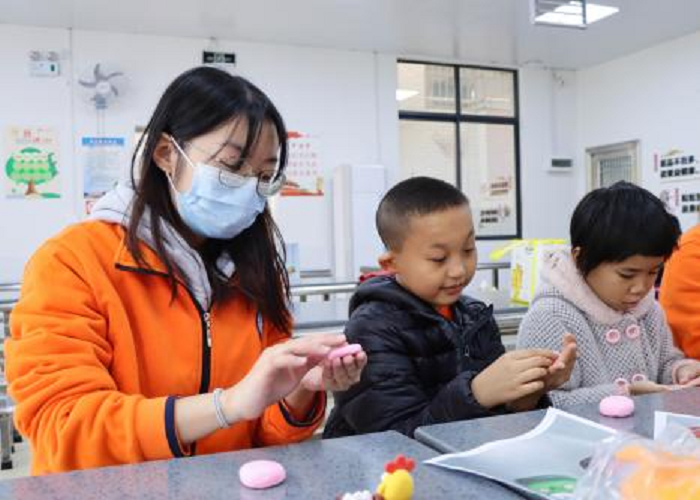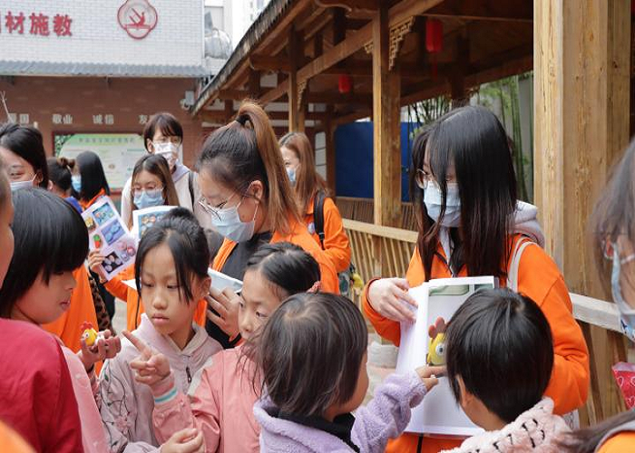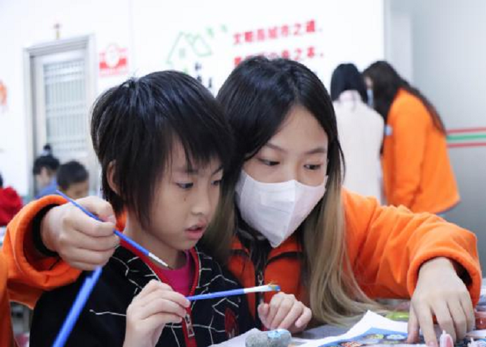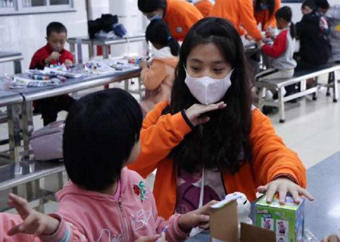 学生党支部成员给聋哑儿童介绍绘画和手工种类