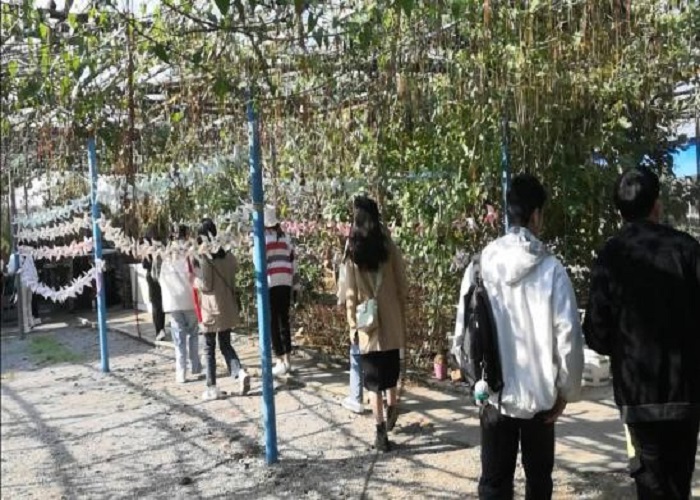 迎着秋月清晨的朝阳,同学们在东校门集合完毕,在纪律委员清点完人数后,同学们乘坐小客车到达葛家乐农庄。