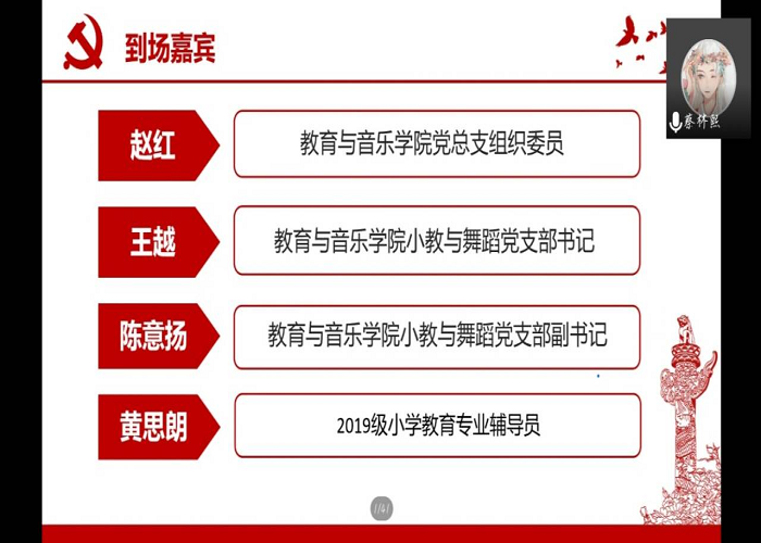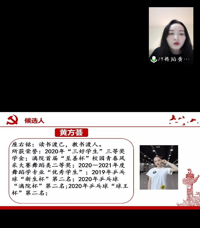 2021年11月16日中午12点30分,教育与音乐学院小教与舞蹈学生党支部通过线上腾讯会议的方式召开党员发展大会,旨在吸纳优秀学生壮大党员队伍,为支部将来的发展打下坚实的基础。参加本次会议有全体党支部成员、教育与音乐学院小教与舞蹈学生党支部书记王越老师、教育与音乐学院党总支组织委员赵红老师等人员。