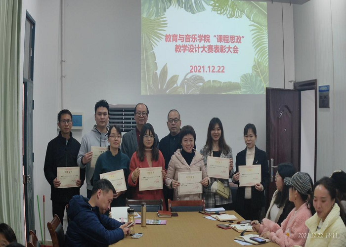 教育与音乐学院课程思政工作领导小组在学校教务科研处的大力支持和直接指导下,于11月-12月举办了课程思政教学设计大赛,经过了初赛和决赛的现场展示,评选出一等奖2名,二等奖3名,三等奖2名,优秀奖13名。12月22日,学院组织了隆重的总结表彰大会。