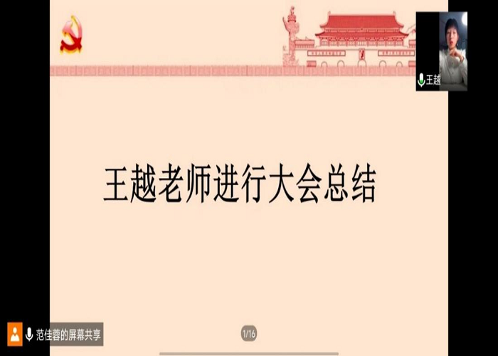 最后,支部书记王越老师进行总结发言。她指出作为一名合格党员要对自己严格要求、实事求是,同时提醒支部成员通过批评与自我批评及时落实整改措施,并要认真学习党的思想理论成果,学习英雄模范人物和我们身边的先进分子,不断勉励自己勇毅前行,为党的事业奉献青春力量。