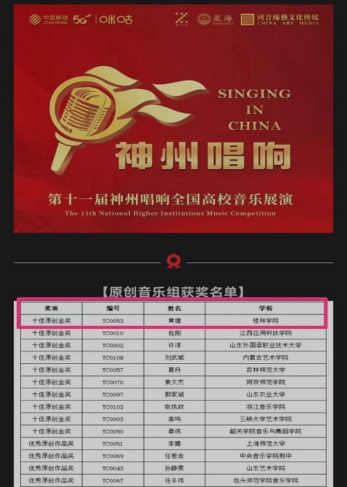 近日,第十一届“神州唱响”全国高校音乐展演完美落幕,我院黄健老师荣登“原创音乐组”十佳金曲榜首!