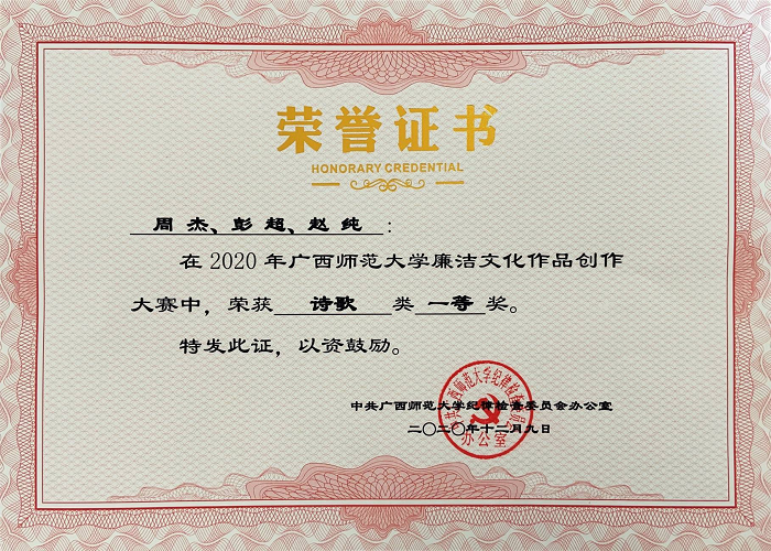 这首歌曲曾经在广西师大廉洁文化作品大赛中获得一等奖。