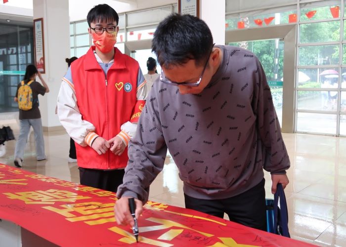 活动开始,陆续有老师来参加活动。负责引导的志愿者,为老师讲解本次活动的意义。老师们了解到,本次签名活动是加强校园清廉文化建设,营造廉洁的文化氛围,促进廉洁与专业建设相融相促,强化廉洁的文化的实践活动。党总支书记周杰带领教师依次上前郑重在横幅上签下自己的名字。此外,在活动期间,也有众多学子好奇上前,引导者也耐心为其讲解。
