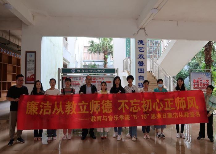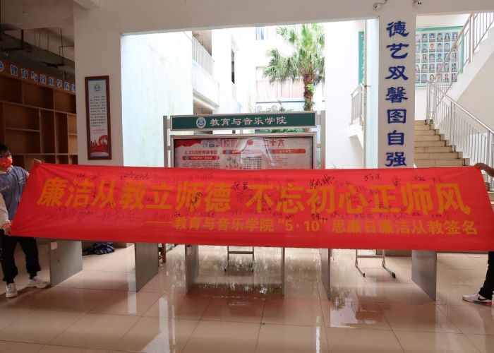 为了响应2022年全区教育系统全面从严治党暨清廉学校建设动员会议部署,落实《桂林学院大力推进清廉学校建设实施方案》,2022年5月26日,桂林学院教育与音乐学院在嘉善楼举办“廉洁从教立师德,不忘初心正师风”主题签名活动。参加本次主题活动的有教育与音乐学院全体教职员工。