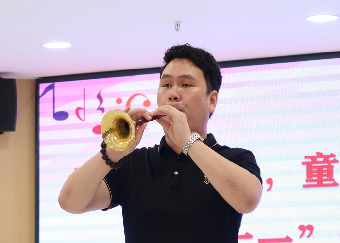 表演结束之后,两所高校的老师现场组织小朋友进行口风琴和竖笛的教学,老师教学得法,小朋友学习认真,不大一会就能吹奏出简单的旋律。