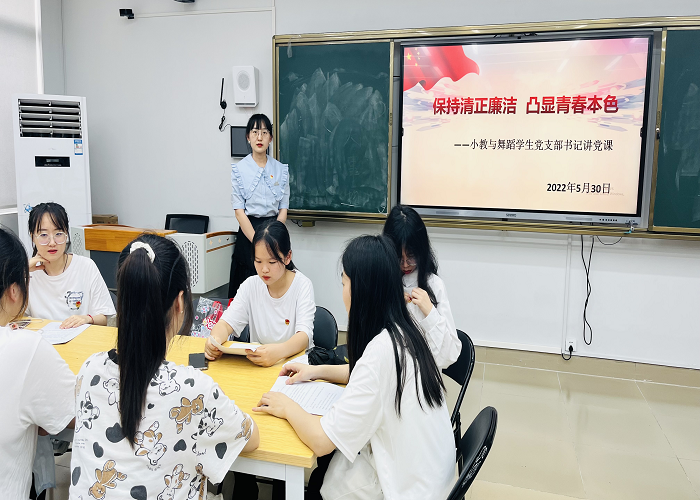 为强化党员廉洁自律意识,加强校园廉洁文化建设,在支部中筑牢廉洁思想根基,5月30日,小教与舞蹈学生党支部在6242实训室开展党支部书记讲党课活动,支部书记王越同志以“保持清正廉洁,凸显青春本色”为主题,给学生党员们上了一堂生动、深刻的党课,党支部全体成员参加了此次活动。