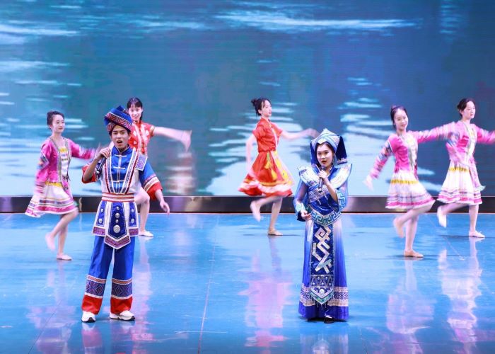 演员罗吉颖:这次音乐会对我们所有同学来说都是一种经历和成长,这场晚会给我们带来了很多全新的经验。在晚会中,我演唱了一首《壮家敬酒歌》,用歌声歌唱美好的生活。虽身为音乐学专业但我同样对舞蹈有着热爱,音乐学专业学生应在钢琴、器乐、声乐、舞蹈、合唱指挥等全能发展,我还有很大的进步空间,争取在未来的学习过程中能够发扬特长、补齐短板,朝着更好的自己进步!