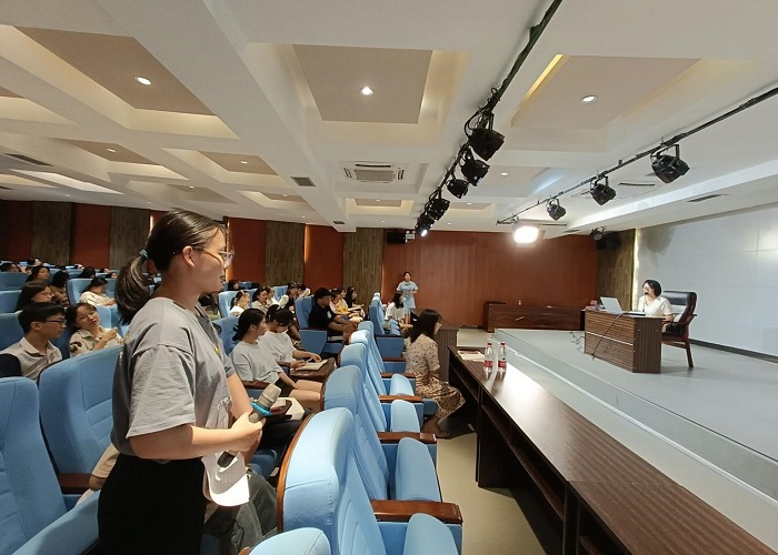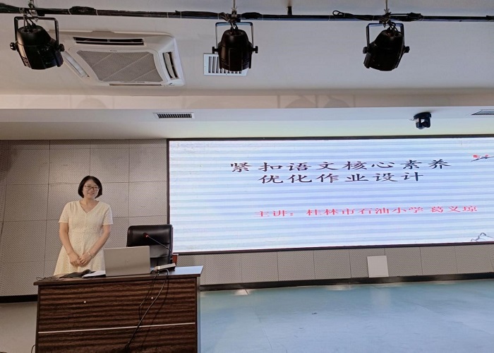 为把握“双减”政策和2022年版语文新课程标准以来小学语文作业设计动态,为学生8月底即将在小学开展教育实习做好准备,6月23日下午在至善讲堂,教育与音乐学院小学教育教研室邀请桂林市石油小学语文骨干教师葛义琼,面向2019级小学教育全体同学做“紧扣核心素养 优化作业”专题讲座,讲座由黄小玲副院长主持。