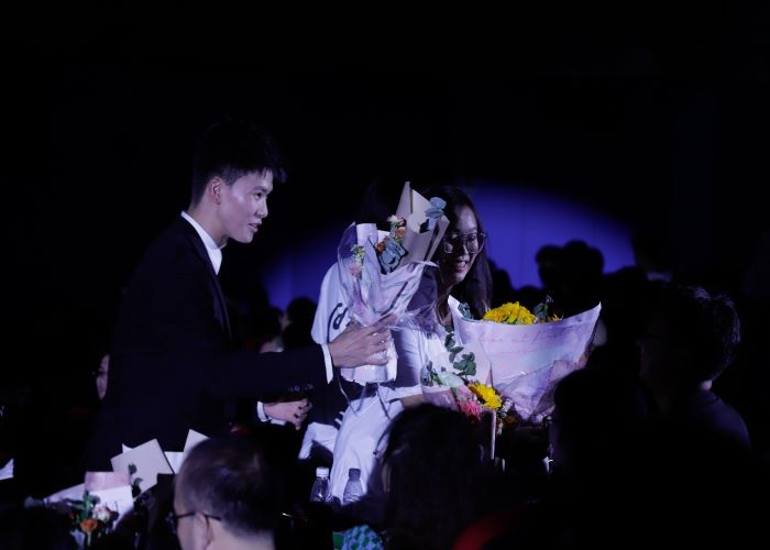 舞蹈节目《渔梦 渔阳》可谓是一场视觉盛宴!舒缓优美的舞姿和色彩灯光碰撞融合,好似真的看见渔家姑娘打鱼时的场景,同时也表现出了音乐学专业教学的多元性,同学们不仅具备优良的音乐素养还有着不错的舞蹈功底。舞蹈节目过后同学们为表达对指导老师的感恩之情,纷纷为老师们献上花束。