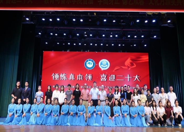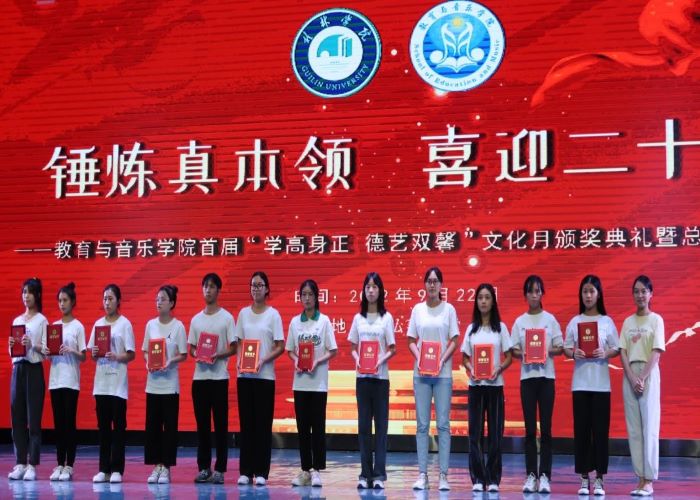 为致敬榜样,表彰先进,进一步发挥先锋模范的示范效应,2022年9月22日下午,教育与音乐学院在弘善讲堂举行了首届“学高身正·德艺双馨”文化月颁奖典礼暨总结表彰大会。学校副校长蒋毅、该院院长彭超,党总支书记周杰、副院长江帆、黄小玲及党总支副书记熊云云出席。参加活动的还有学院专任教师代表、全体辅导员及200余名学生代表。
