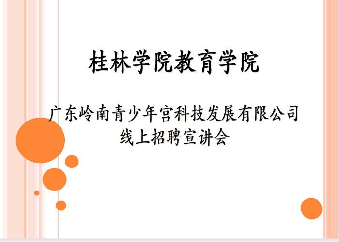 疫情防控期间,桂林学院教育学院根据学校2023届毕业生就业指导与服务工作的相关会议精神,主动出击,更好的为毕业生搭建便捷、精准的就业服务平台, 2022年11月24日,教育学院邀请广东岭南青少年宫科技发展有限公司在腾讯会议平台上召开了线上招聘会和就业宣讲会。本场招聘会由毕业班辅导员张梅洁主持。学院小学教育、学前教育、舞蹈学专业毕业生百余人参加。