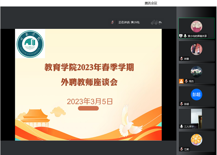 为了做好外聘教师的管理与服务工作,3月5日晚上学院组织本学期担任教学的外聘教师在“腾讯会议”召开了以“教学日常规范管理、师风师德建设”为主题的云端交流会。学院班子成员、各教研室主任和教学秘书参会,会议由学院党总支书记周杰主持。