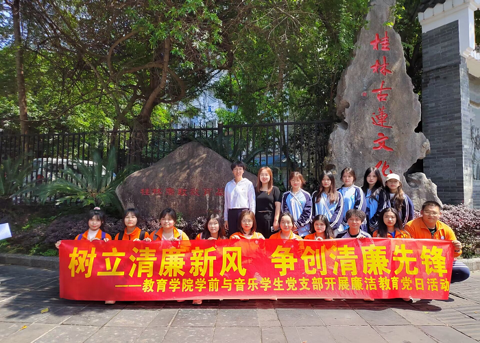 为进一步增强支部党员的廉洁意识,筑牢拒腐防变的思想道德防线,切实加强党风廉政建设工作,营造风清气正的校园环境,2023年4月26日,桂林学院教育学院学前与音乐学生党支部组织党员、预备党员和积极分子代表到桂林市廉政教育基地——古莲文化街开展“树立清廉新风 ,争创清廉先锋”清廉教育主题党日活动。