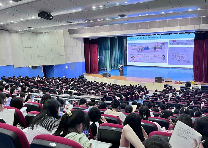 为贯彻落实小学教育专业“高校教师理论讲授+小学教师一线指导”的教师教育共同体建设,让师生更好把握小学在“双减”和2022年新课标以来的课堂改革。5月18日,我校小学教育专业邀请全国优秀教研工作者、广西特级教师、桂林学院客座教授、广西师范大学附属小学(桂林市七星区卓然小学)陈燕虹老师在弘善讲堂面向小学教育专业500余名学生开展讲座,向学生们分享了从教以来的小学数学教学研究成果——基于素养下的小学数学阅读与数学学习。
