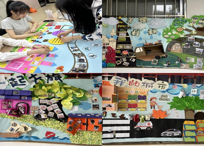 课程团队设计实践主题,提供学生展示和实践的平台,引导学生在理解儿童身心发展基础上,从儿童视角进行多角度创作,经过展示与汇报后教师点评、选出优秀作品在学前教育实训教室外进行展示。