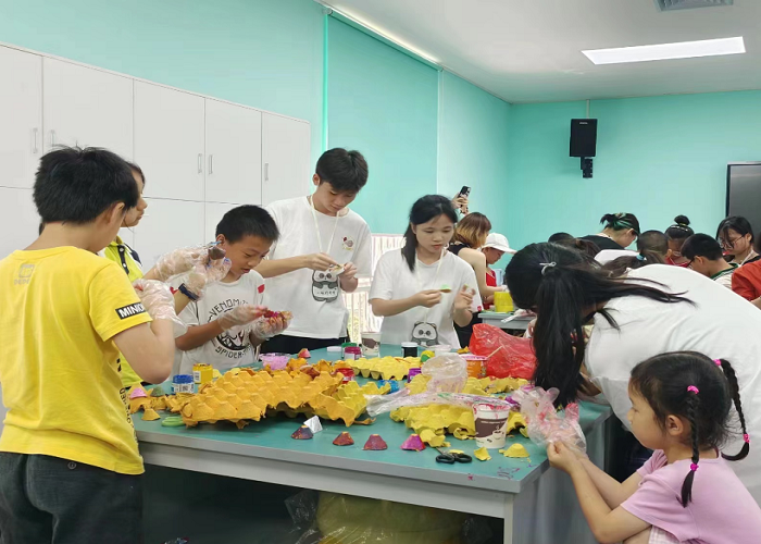 上午10点,学生助教老师和君武小学学生进行了“环保拍手歌”的破冰小互动,在互动中增进彼此的感情,同时也呼应了环保的主题。然后在助教老师的带领下,小朋友们分组进行了不同内容的环保项目,分别是“环保小话剧”“画一个地球纸浆画”“制作蛋壳风铃”。在各个项目中小朋友亲自参与手工制品的制作以及话剧的演出,在互动与表演中学习到与环保相关的知识,将环保意识根植于小朋友的心中。最后,在助教老师的帮助下,各组小朋友们上台展示了作品和话剧,制作出的手工成品都让人眼前一亮,话剧小组的小朋友们倾情演绎的环保小话剧也得到了现场其他小朋友和家长们的赞扬。