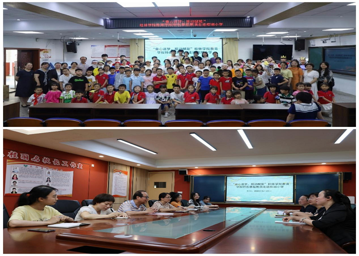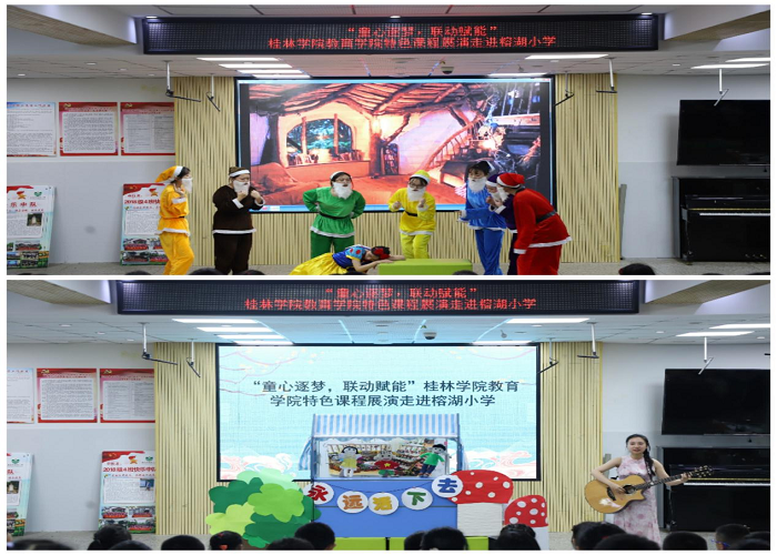 伴随花的芬芳,踏着歌的节拍,教育学院院长彭超、副院长黄小玲以及学前教育、小学教育教研室师生一行,5月31日教育学院“童心逐梦,联动赋能”特色课程展演走进桂林市秀峰区榕湖小学,2020级学前教育和小学教育学生以手偶剧和儿童剧形式演绎孩子们喜欢的故事,激发阅读的兴趣,送上我院对小学生的“六一”儿童节的美好祝福。
