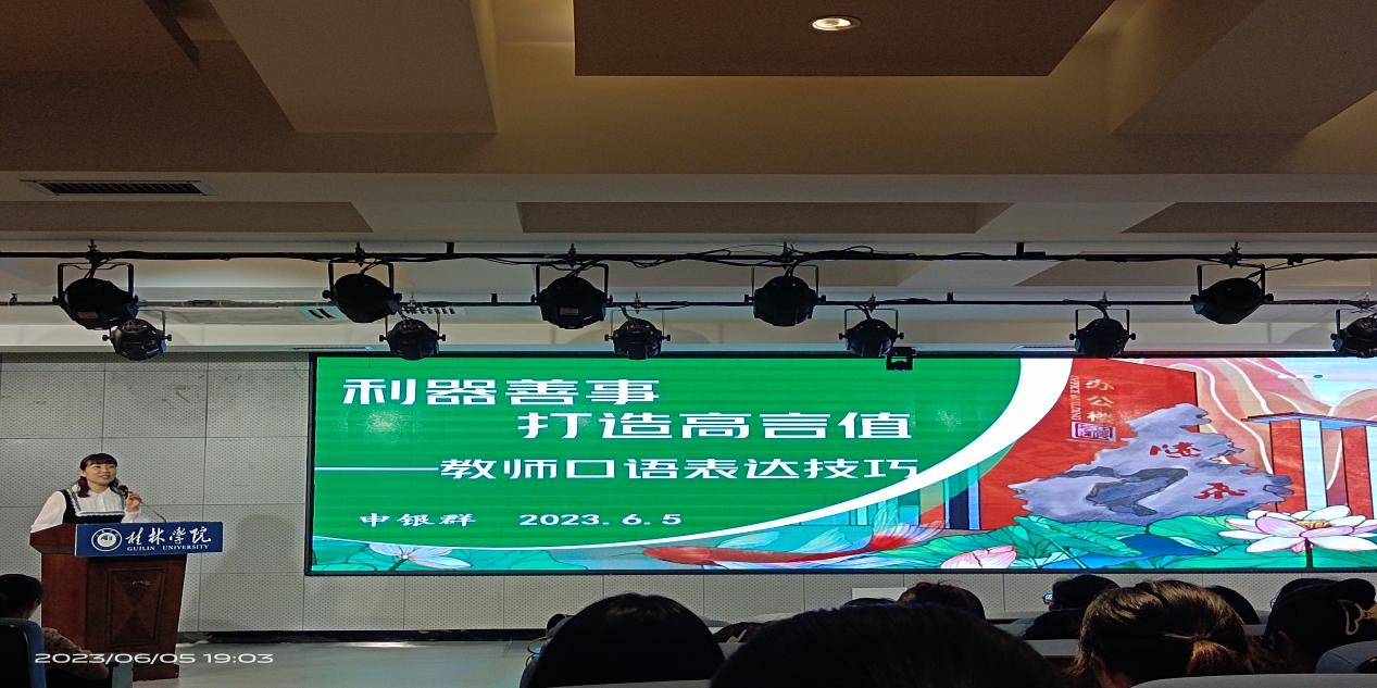 本着让学生感知“激励之言催人奋进,温情之言感人心脾”的教师语言魅力,提高学生在真实课堂中的语言素养及应用能力,6月5日晚上,教育学院邀请桂林市学科带头人申银群老师,在至善讲堂面向2020级小学教育全体学生作“利器善事,打造高“言”值——教师口语表达技巧”主题讲座,讲座由教育学院副院长黄小玲老师主持。