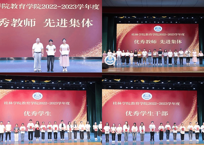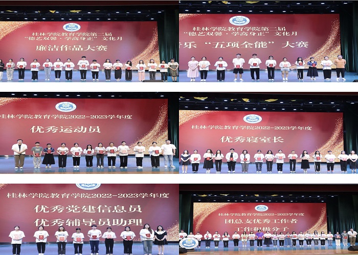 为表彰过去一学年表现突出的先进集体和优秀个人,激励我院学生勤奋学习、创新进取,2023年6月9日,桂林学院教育学院举办第二届“学高身正·德艺双馨”文化月闭幕式暨2022-2023学年度总结表彰大会,我院党总支书记周杰、副院长黄小玲、团总支书记陈意扬、团总支副书记梁琪、各教研室教师、全体辅导员及学生代表参加本次大会。