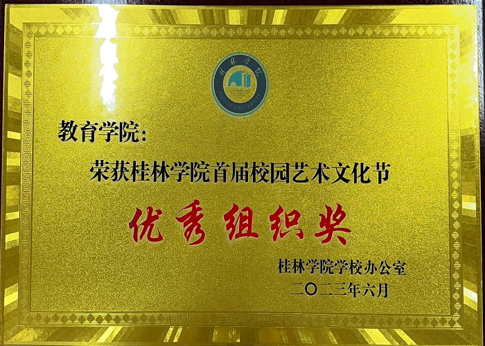 2023年6月26日下午,桂林学院于弘善讲堂举办首届校园艺术文化街闭幕式暨总结表彰大会,我院在桂林学院首届校园艺术文化节中荣获优秀组织奖。