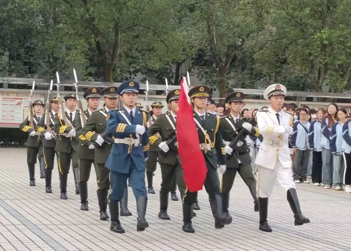 早上7时,在雄壮的国歌声中,国旗队的同学迈着矫健的步伐,护卫着国旗走向升旗台。五星红旗冉冉升起,迎风招展,全体师生肃立行礼、高唱国歌,神圣庄严的爱国主义氛围感染着全体师生,升旗结束时,全场自发热烈鼓掌。