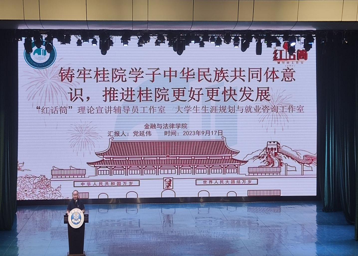 为铸牢桂院学子中华民族共同体意识,对学生进行民族团结教育,9月17日晚,教育学院于弘善讲堂开展铸牢中华民族共同体意识专题讲座。本次讲座由金融与法律学院辅导员党延伟老师主讲,教育学院2023级全体新生参加。