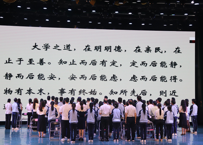 随后,新生代表向老师们行拜师礼。礼成之后,大家共同朗读《大学》片段。全场庄严肃穆,向新生传递了“尊师重道”的理念。