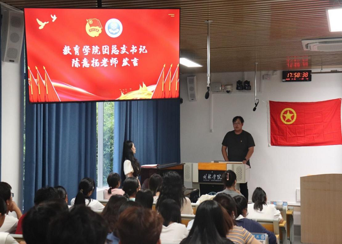 为促进我院团学新老干部之间的沟通与合作,使2023级同学们及时了解我院团总支、学生会部门的工作内容与工作情况,9月25日,教育学院团总支学生会于1214教室开展“挺膺奋进担使命,青春向党建新功”为主题的见面会,本次例会由学生副书记方馨苡主持,党总支副书记宋丹阳、团总支书记陈意扬、团总支副书记谭小莉及全体团学学生干部参加。