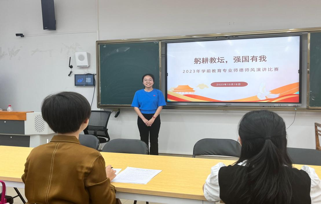 10月16日下午,学前教育专业在6242教室组织了以“躬耕教坛,强国有我”为主题的师范生演讲演讲比赛。在校的2021-2023共3个年级学生积极报名参加比赛,传媒学院的魏莉、学前教育武文斯和何琪欣老师担任评委。