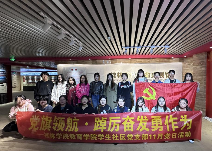 为了更好地学习党的二十大精神,传承红色基因,坚定理想信念,感悟初心使命,2023年11月22日教育学院学生社区党支部来到桂林理工大学近代革命史展馆开展“党旗领航,踔厉奋发勇作为”主题党日活动。参加本次活动的有支部书记张梅洁老师、支部副书记王雅老师和支部部分成员。