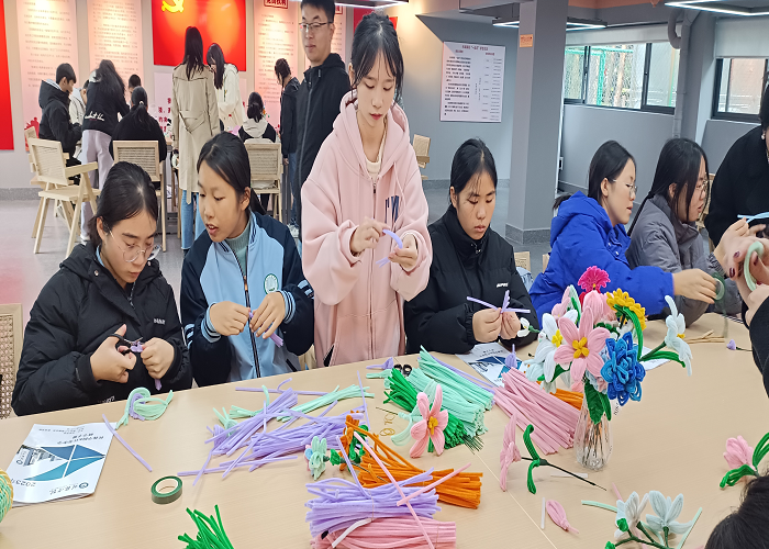 在杉湖家苑一站式学生社区,2021级学前教育专业的学生8人带领中学生们利用扭扭棒进行花卉的制作,在桂林学院学生的带领下,百寿中学的学生在短短一节课里感受到了手工制作的神奇和乐趣,每个人都制作出了百合、向日葵等各种扭扭棒花卉,制作现场热情高涨。