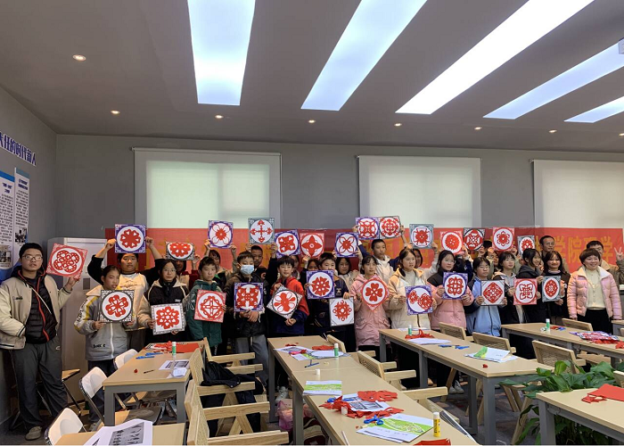 在辅导员工作室,由教育学院学前教育2021学前的学生刘熠熠介绍剪纸的文化、历史渊源、剪纸的种类,接着由黄红韩老师带领研学学生进行四角团花剪纸的制作,在黄红韩老师及6位学前学生的协助下,各式各样团花剪纸的图案在研学学生手中悄然绽放,大家都成功制作了团花剪纸。