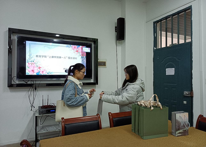 为提升学生的自律意识,营造良好的学习环境,11月25-12月5号,教育学院开展“上课早到第一人”擂台活动,活动为期十天,各参赛人员根据自己的课表,在每天上午的第一节课和下午的第一节课持小卡片拍照进行打卡活动。
