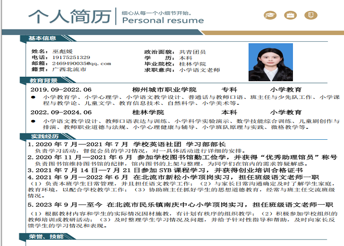 为提高就业竞争力,引导大学生意识到简历的重要性,尽早地掌握写简历的技巧,2023年11月29日至12月6日,教育学院举办了2024届毕业生简历制作大赛。