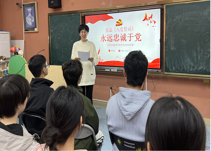 为加强基层党组织建设和党员思想建设,2023年12月8日下午,教育学院学生社区党支部书记张梅洁同志在嘉善楼6242教室以“重温入党誓词,永远忠诚于党”为题,主讲专题党课,支部全体党员、预备党员参加党课学习。